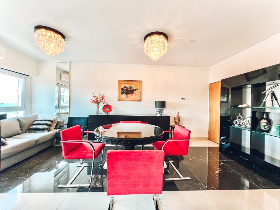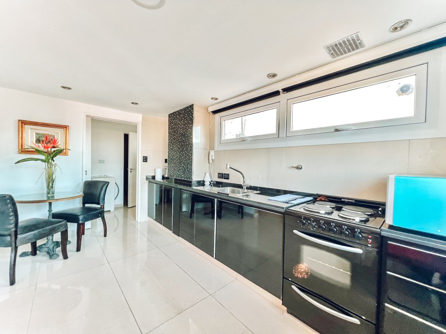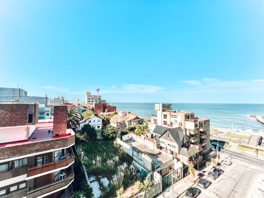 Desde el living comedor al frente con pisos de porcelanato se accede al balcón saliente con hermosa vista al mar. Además, cuenta con cocina integrada con barra y sector de desayunador, lavadero separado, baño con ducha y toilette de visitas.