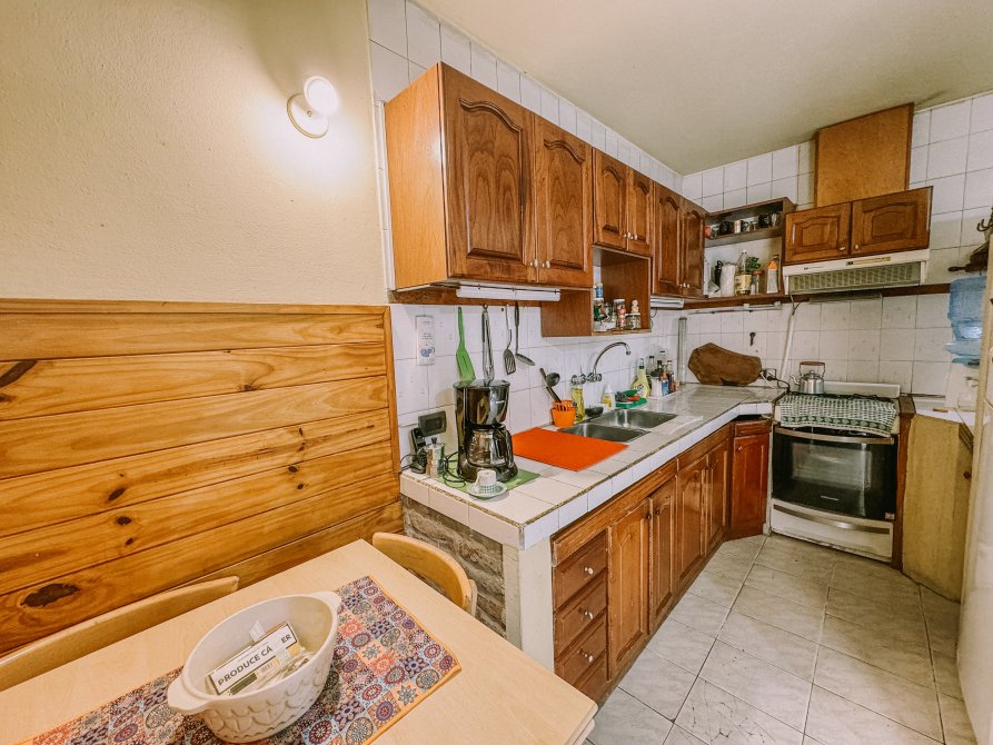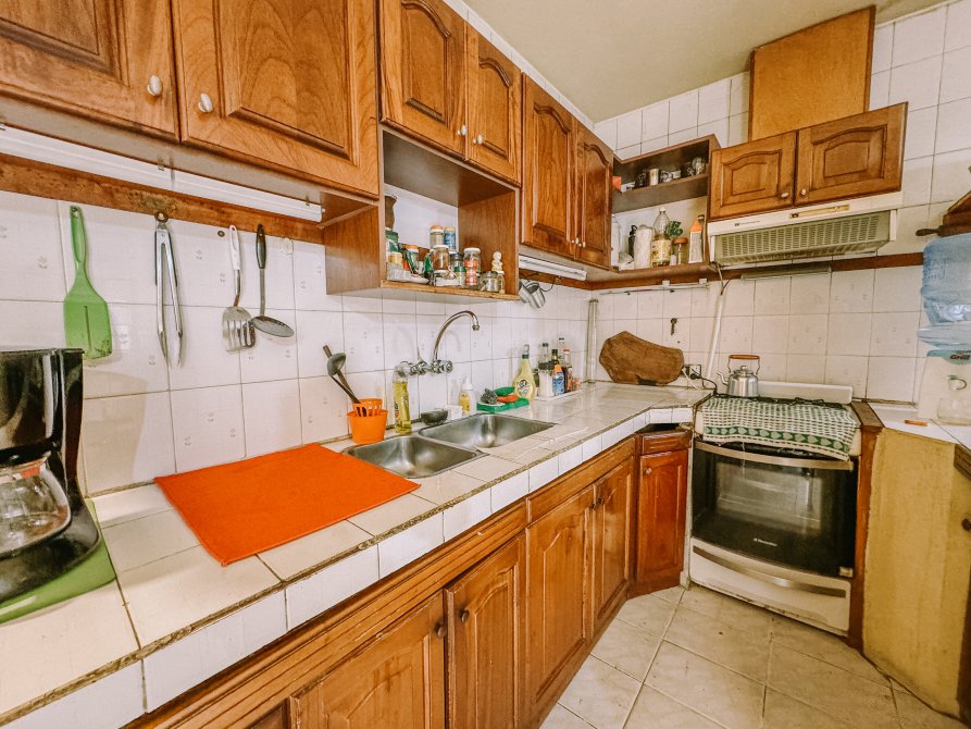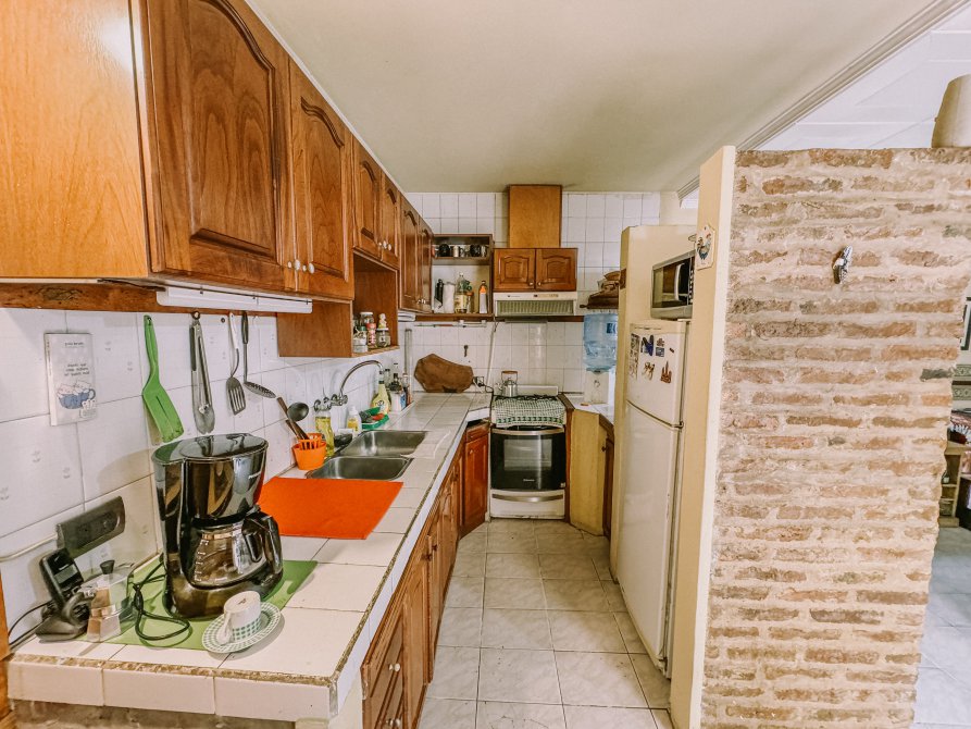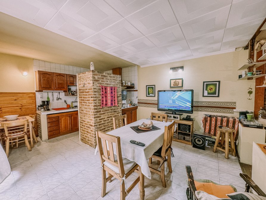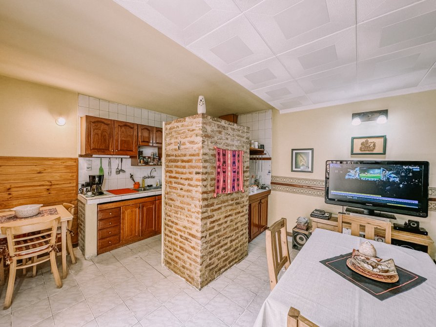 La cocina, de estilo tradicional, presenta muebles bajo y sobre mesada, brindando amplio espacio de almacenamiento. Además, cuenta con un comedor diario ideal para desayunos o comidas informales. Desde la cocina, se accede a un patio con parrilla, perfecto para reuniones al aire libre. También cuenta con una salida lateral para mayor comodidad.