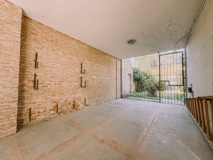 La propiedad cuenta con un amplio espacio libre al frente, con piletas y un portón con paredón, ofreciendo privacidad y seguridad. Además, hay espacio para tres autos descubiertos y uno cubierto.