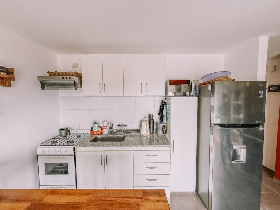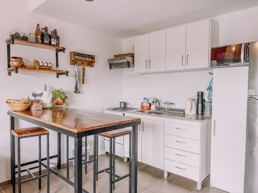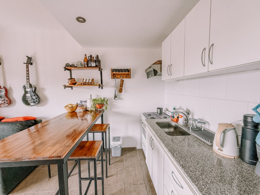 - Cocina integrada al living, con muebles bajo mesada y alacena, funcionando completamente a gas natural.
