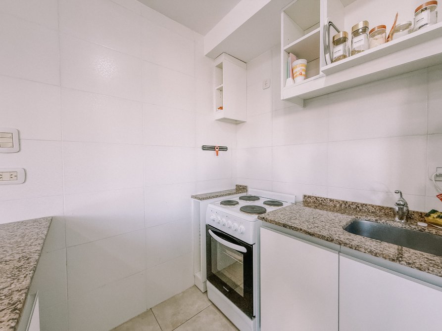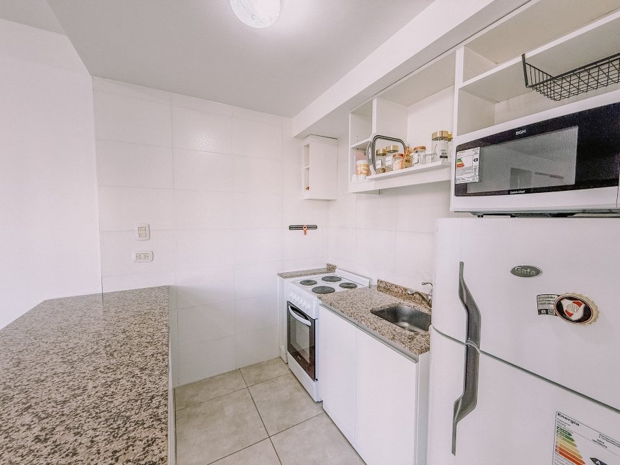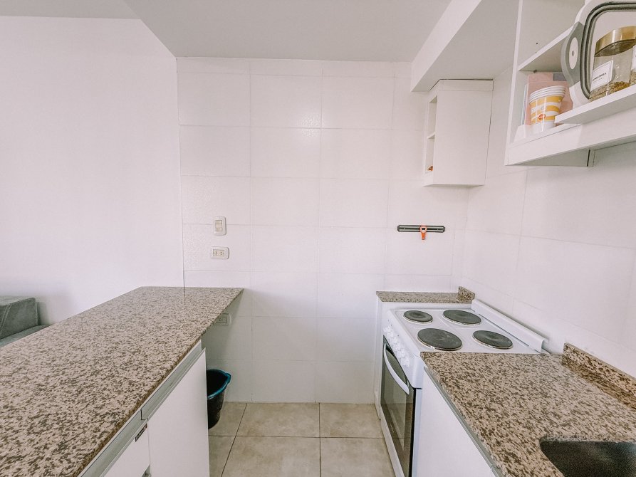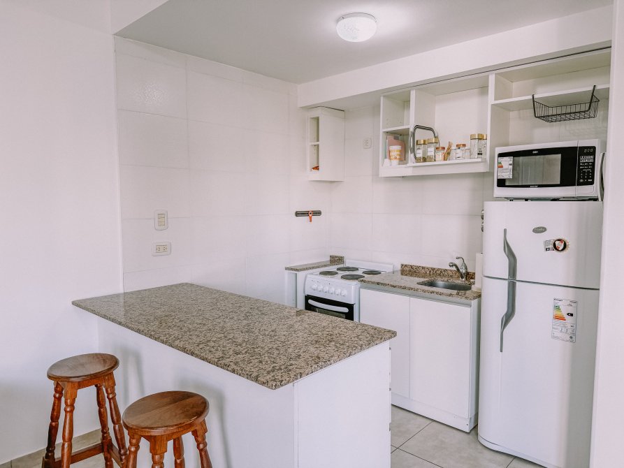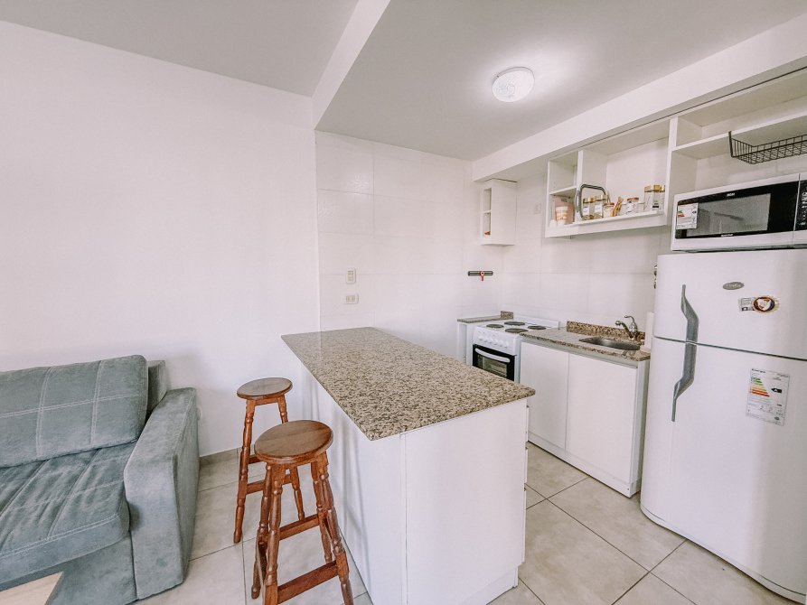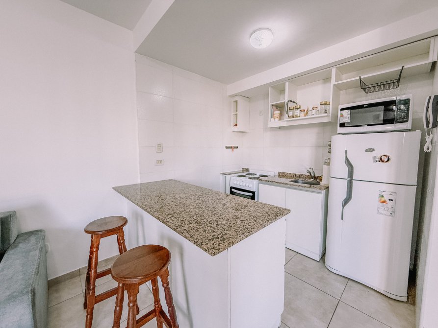 La cocina integrada es eléctrica y cuenta con una práctica barra desayunadora, ideal para aprovechar el espacio y disfrutar de las comidas diarias.