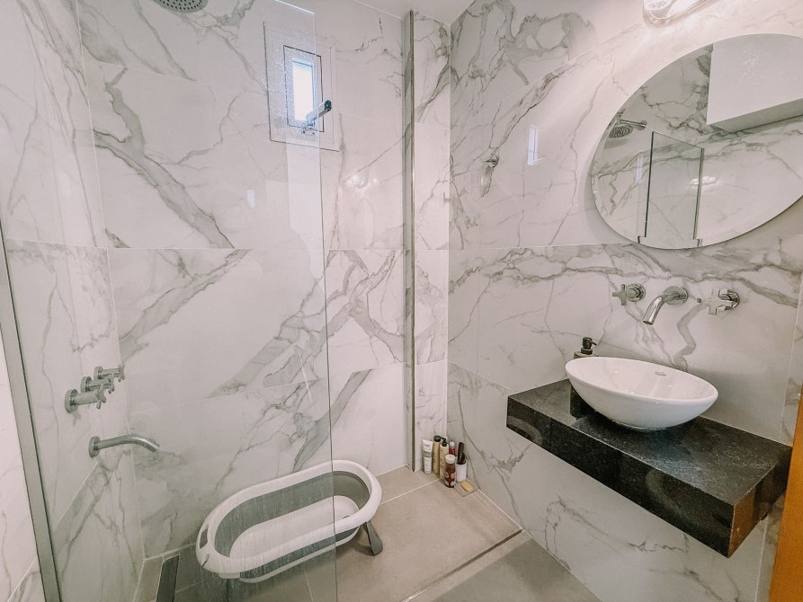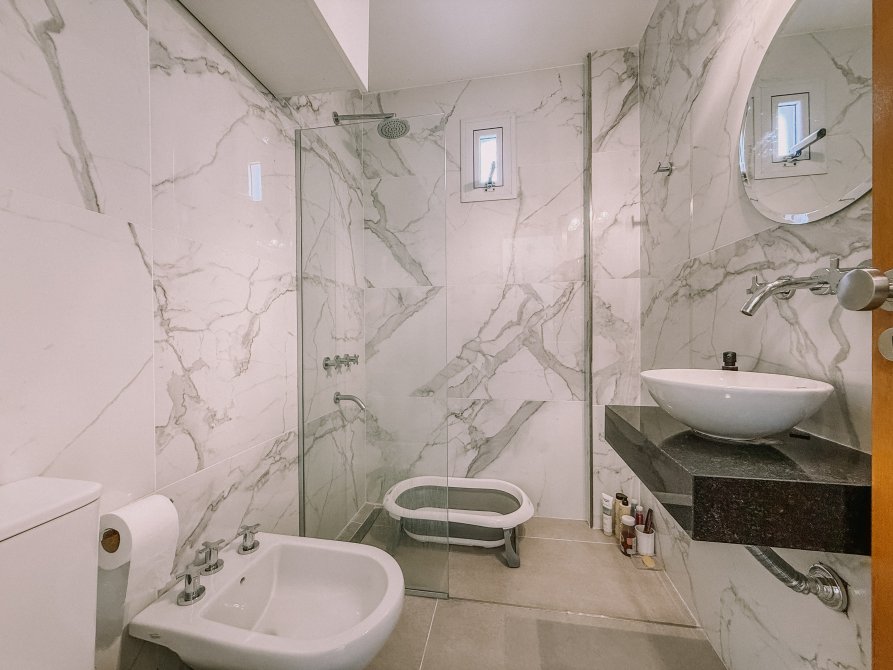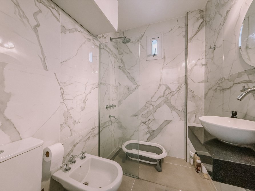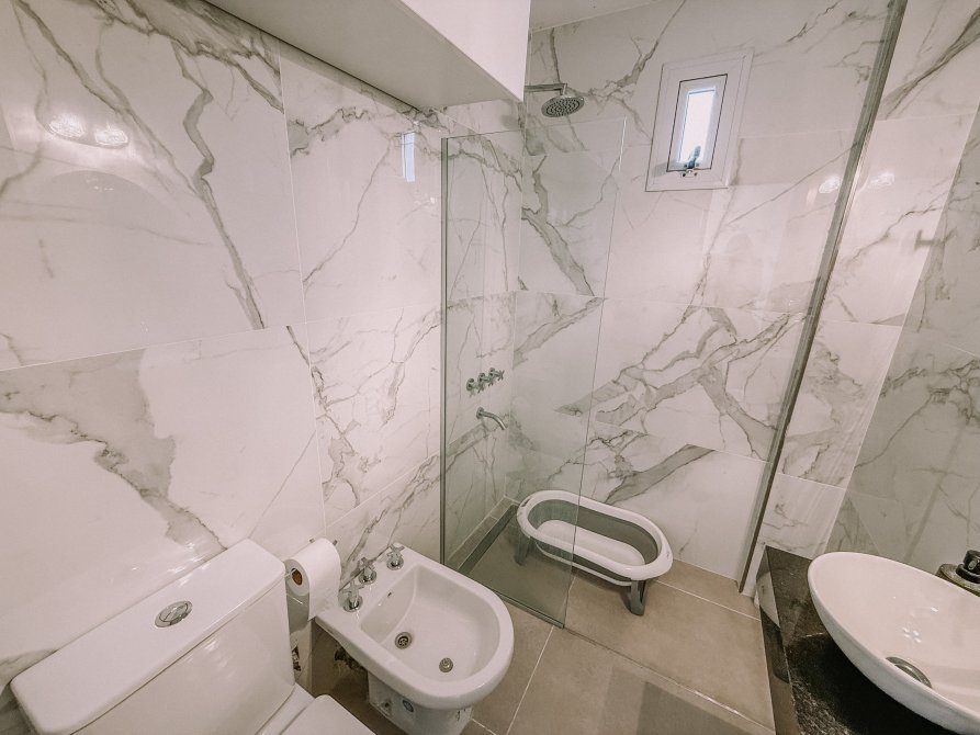 • Baño con ducha moderna y revestimiento simil mármol Carrara