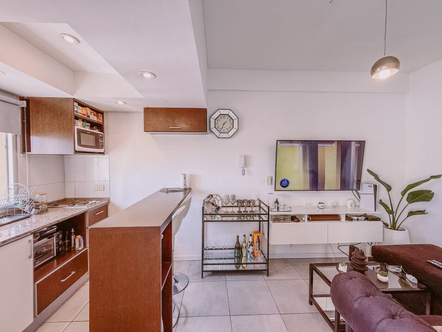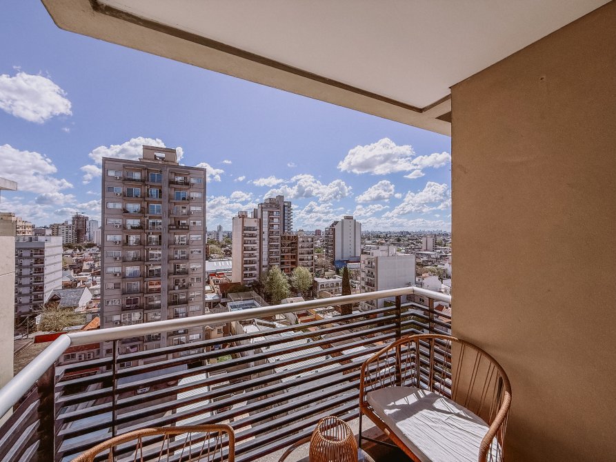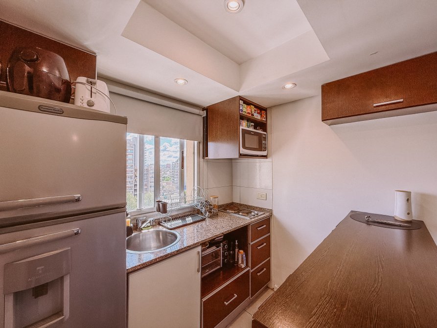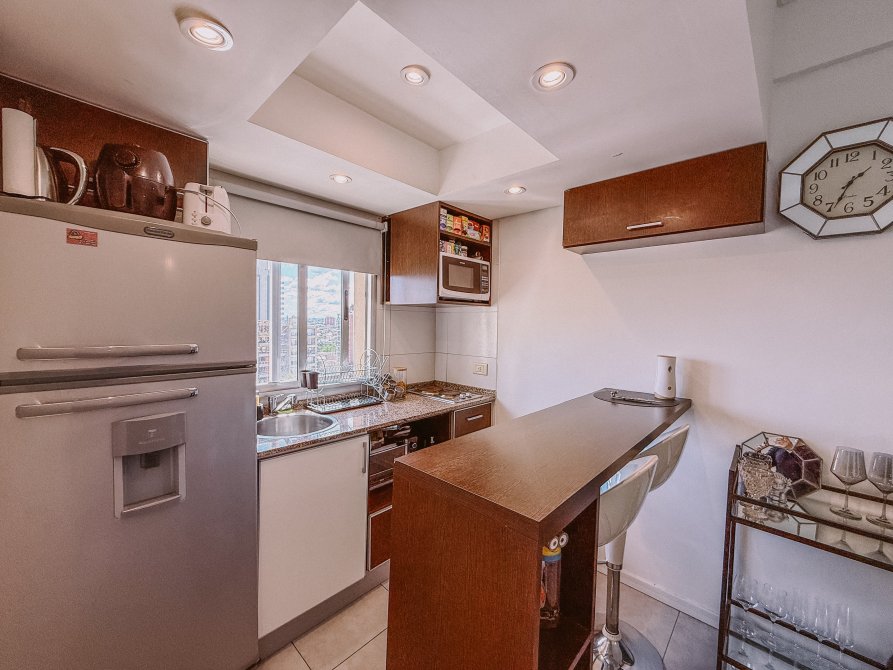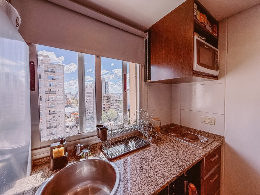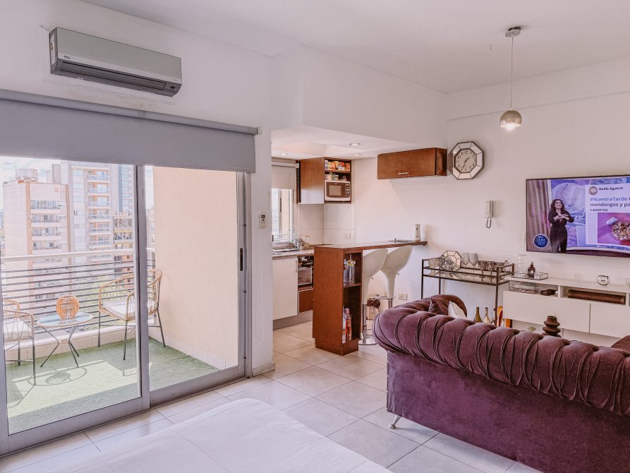 La unidad cuenta con 33 m² totales distribuidos en un ambiente luminoso con salida a balcón y inmejorable vista panorámica. Cocina equipada con muebles bajo mesada y alacena, baño completo con bañera, pisos cerámicos de primera calidad y equipo de aire acondicionado frío/calor.