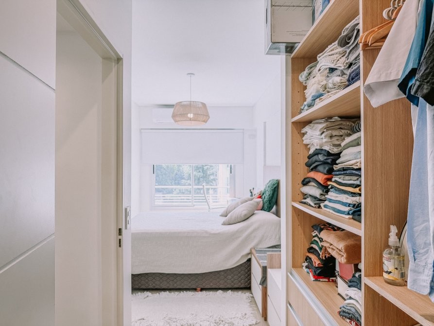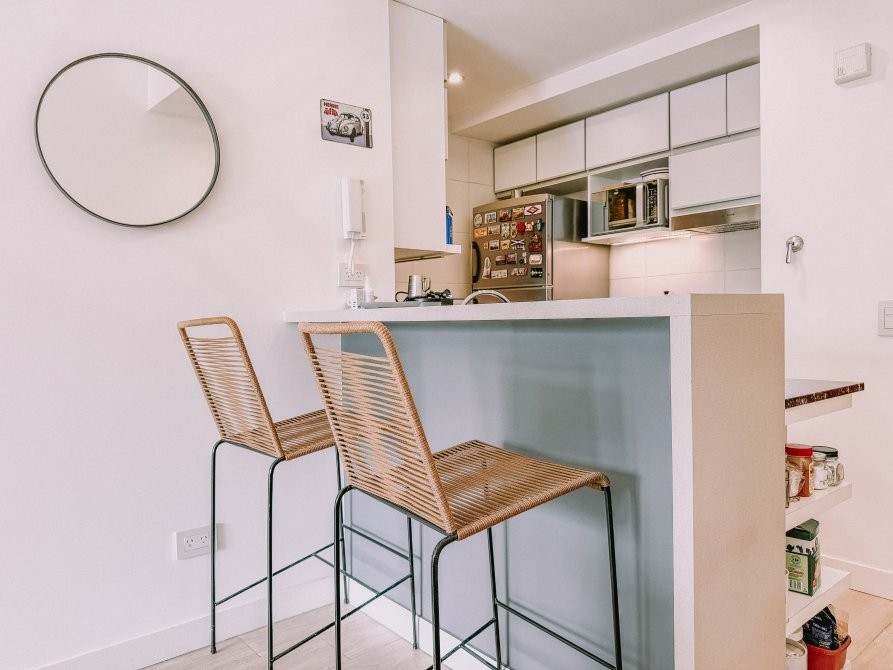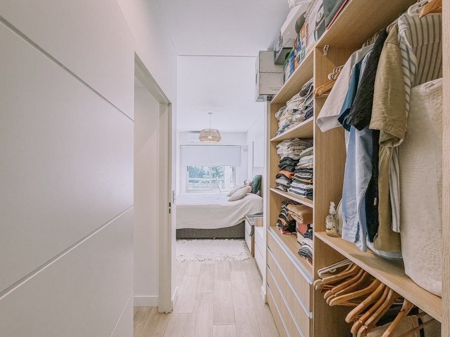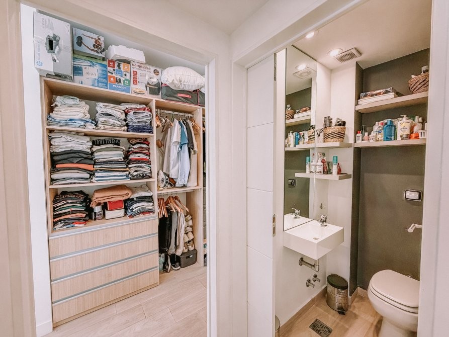 Cocina a gas con barra desayunadora, toilette de recepción y habitación en suite con espacio de escritorio, amplio vestidor y baño completo.