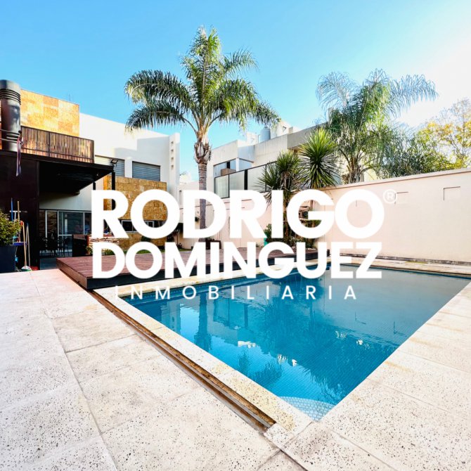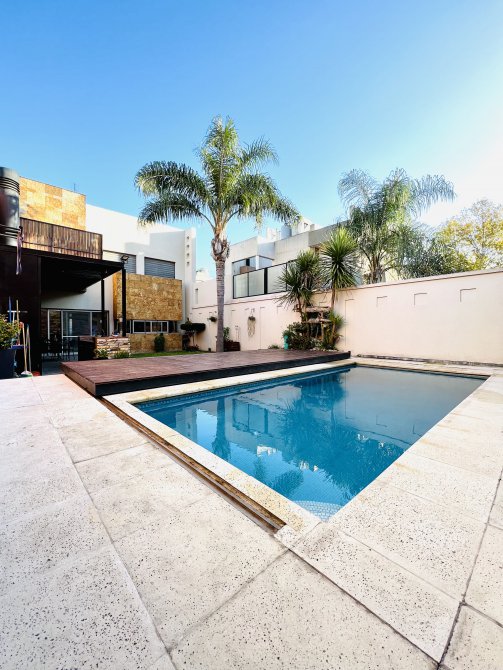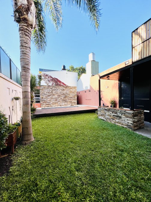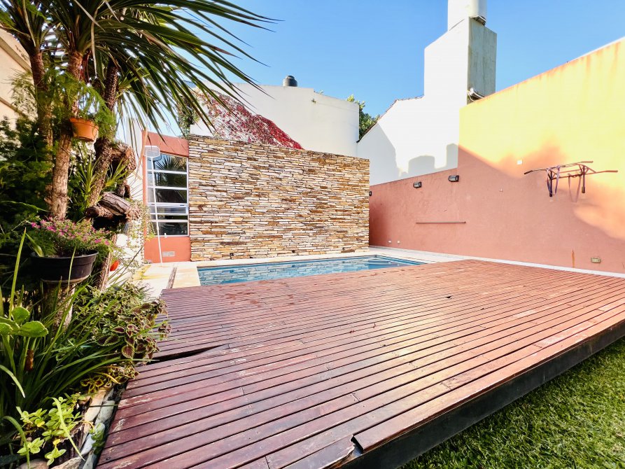 Fondo con hermosa pileta con un deck que la recubre para cuando no se usa poder utilizar ese espacio, muchas plantas, divina palmera y un sector con una parrilla divina.